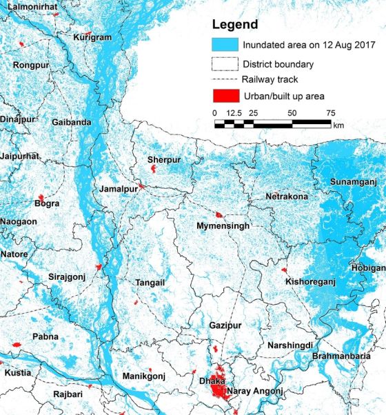 This map shows flood inundated areas on 12 August 2017 in northern Bangladesh. It has been prepared using Sentinel-1 Synthetic-aperture radar (SAR) images acquired from the European Space Agency